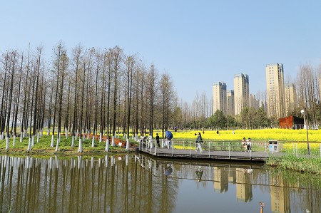 生態(tài)走廊的油菜花海,沿著湖濱徐徐漫開,蜿蜒曲折,高低錯落,中間還設計了木棧道和觀景小道,方便市民在花叢間打卡拍照或休閑放松。其間還點綴了紫色的二月蘭,蜜蜂嗡嗡地穿梭,翅膀在陽光下閃著微光,春天浪漫氛圍感拉滿!漫步木棧道,穿梭于花海,瞬間被整片溫柔與明亮包裹,紅白相間的風車、立體卡通雕塑,恍如置身浪漫的童話世界。陽光映照下,從耀眼的金黃到溫柔的橘黃,從腳下一直漫卷,風一吹,花浪起伏,與遠處林立的高樓,構成一幅奇妙的城市田園長卷。